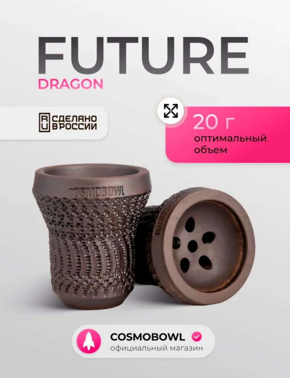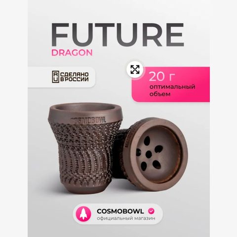 • Cosmo BOWL Future это классическая глиняная чаша для кальяна в форм-факторе «турка». Чаша представлена в нескольких дизайнах: Dragon, Predator. Изделие представляет собой чашу, выполненную из высококачественной красной глины, не содержащей в своей структуре посторонних примесей. Для большей прочности и удобства в эксплуатации изделие имеет финишный (защитный слой) молочение. Чаши, покрытые молочением, дольше служат и меньше впитывают в себя сироп от табачных масс.