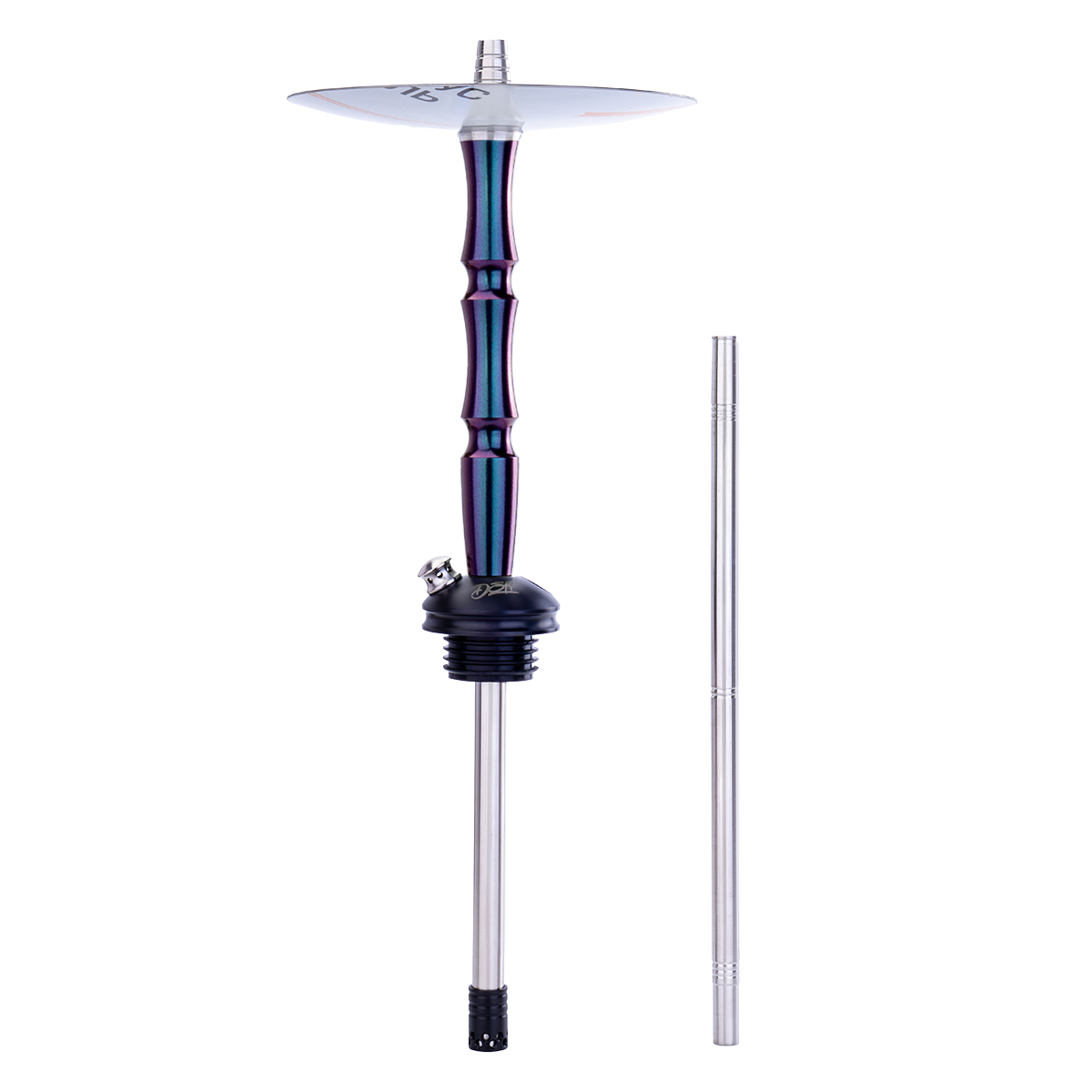 • Шахта кальяна, блюдце и мундштук выполнены полностью из нержавеющей стали AISI 304, основание изготовлено из немецкого полиацеталя, а накладка на шахте из крашеного алюминия. Кальян оснащен диффузором из полиацеталя, выдвигающимся из погружной трубки, коннектор шланга и клапан продувки крепятся к базе кальяна на внутреннем уплотнительном кольце.